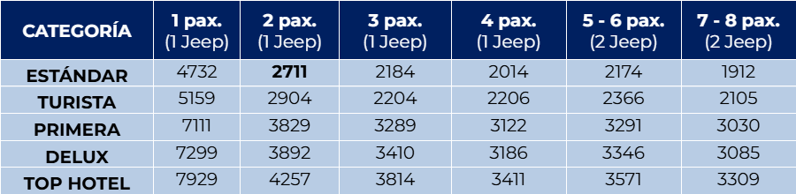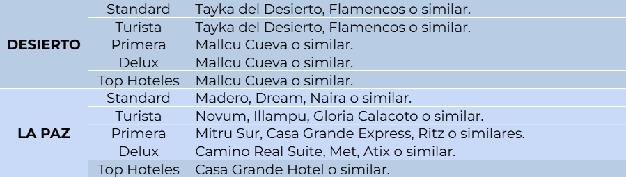 Finalmente, retornaremos sobre el salar para contemplar la puesta del sol con efecto espejo, una experiencia inolvidable. Posteriormente, regresó al pueblo y traslado al hotel seleccionado. Alojamiento.